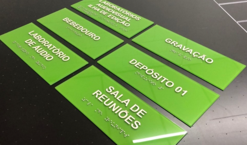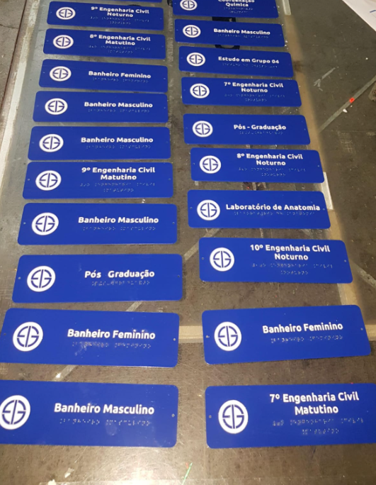 Também produzimos placas em braille com texto em relevo e escrita tátil conforme normas de acessibilidade, ideais para identificar ambientes como banheiros, salas, elevadores e andares. Fabricadas em materiais resistentes, com cantos arredondados, cores contrastantes e instalação recomendada entre 1,20 m e 1,60 m do piso. Garantem segurança, autonomia e inclusão para pessoas com deficiência visual em espaços públicos e privados. Produção com alto padrão de qualidade, acabamento seguro e atendimento personalizado conforme as exigências legais de acessibilidade.